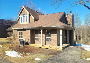 Beautifully cared for, light-filled 2-bedroom, 2 bath Walnut Hill Golf Villa end unit offering a peaceful wooded setting with seasonal treetop views overlooking Eagle Ridge North Course #11 and the iconic historic red barn below.